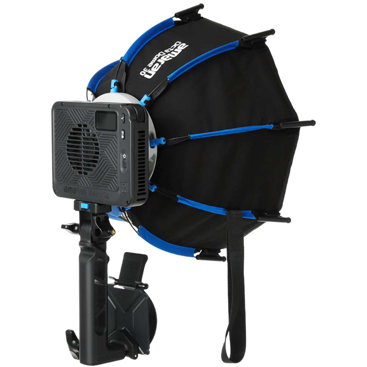 The fixture's metal, full-size Bowens mount is fully compatible with the separately available Mini Reflector, Mini Fresnel, and other Bowens modifiers. In addition, a 6.35 mm screw mount allows attachment to optional mounting gear. amaran adds a 30 cm diameter one-snap setup Octa Dome 30 softbox, along with a convenient Ace Lock to Baby Pin Adapter Grip for quick mounting to optional light stands or handheld use with optional portable batteries. The accessory features a durable silicone strap for securing your power source.