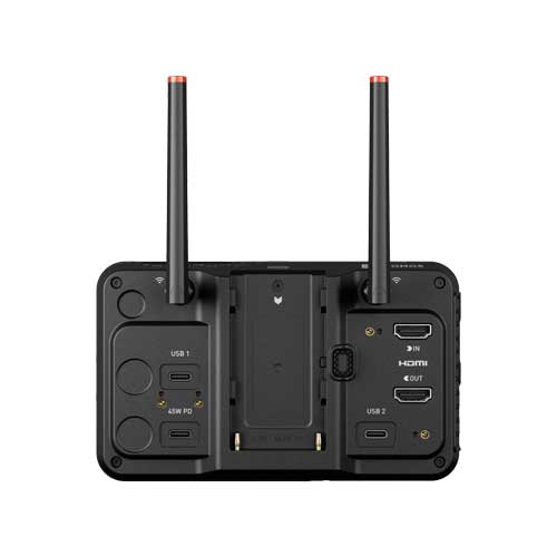 An L-series battery plate on the back of the Ninja TX can support NP-F L-series batteries. An optional battery eliminator can be used to provide DC power to the monitor. A USB-C port supports 30W PD power delivery with the included cable.