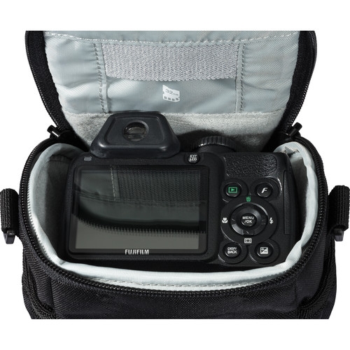 With a padded compartment for your camera, the black Adventura SH 100 II Shoulder Bag from Lowepro is designed to hold and protect your point and shoot camera with attached lens from dust, dirt, and the elements. The SH 100 II features a single top-loading camera compartment with a removable divider for organizing your gear. Store your memory cards in the touch-fastening, slip-in dedicated memory card pocket. Pleated pockets, one on either side of the bag are suitable for storing items such as a small flashlight, cellphone, pens, or energy bar.
