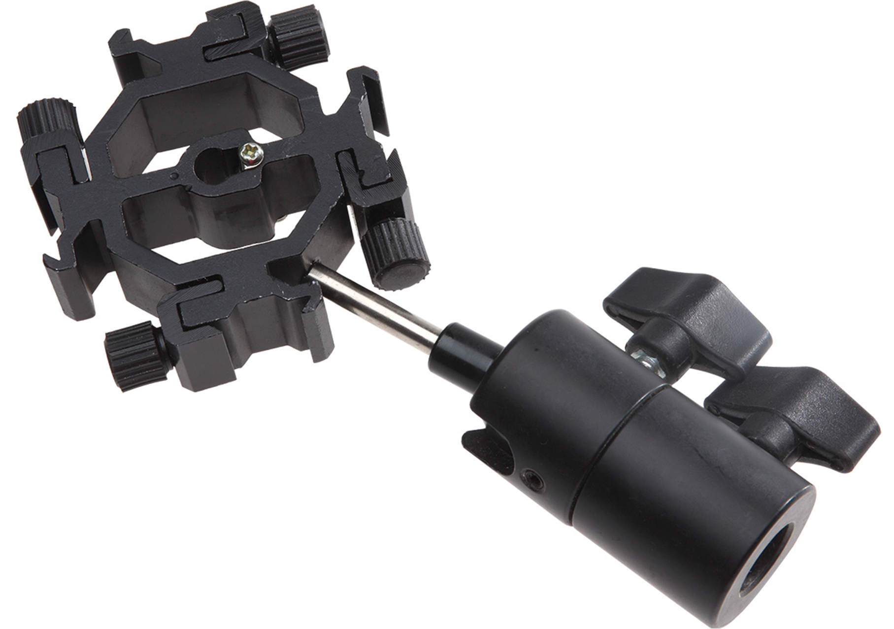 The quard Threat is made of lightweight but durable polymer with metal shoes with knurled locking knobs. The center hole is made for all standard umbrella shafts or you can use the 1/4"-20 tap to secure it to a bracket. The bracket is then attached to a ballhead, This gives you the ability to easily adjust the angle and position of your lights,