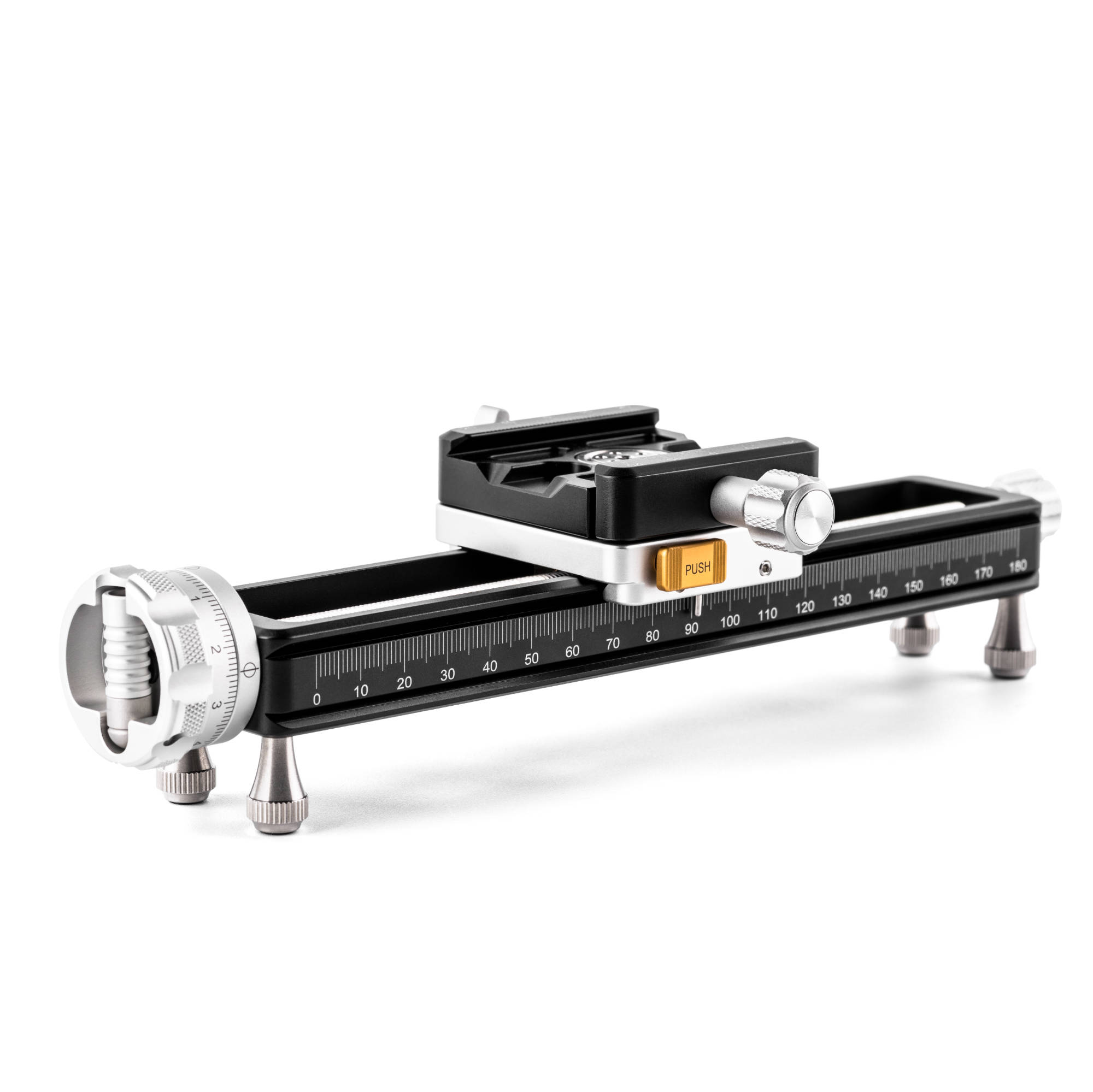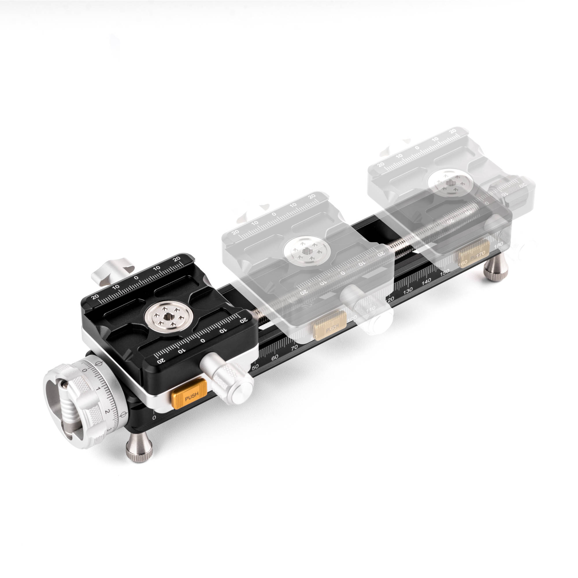 - The NiSi Quick Adjustment Macro Focusing Rail NM-200S with 360 Degree Rotating Clamp gives you the ability to precisely adjust the position of your camera when shooting macro photography. The rail is equipped with an integrated Arca-type compatible quick-release clamp and also includes an Arca-type plate. The clamp is able to be quickly positioned using a push button to make large adjustments quickly. The focusing rail itself has a double-dovetail mount and will fit most Arca-type clamps on the market. The mounting clamp allows 360-degree rotation to change the camera direction without having to remove the plate from the clamp. The adjustment range is 180mm while the rail size is 200mm, maximizing the movement of the camera. The movement is adjusted by a Collapsible Thumb-Screw Knob which makes it easy to adjust and store. The collapsable thumb screw knob has been upgraded and features engraved index markings for precise adjustment. Included is a longer quick-release plate designed for telephoto lenses and with a groove for straps and is easy to lock and release. The maximum load of the rail is 5kg.