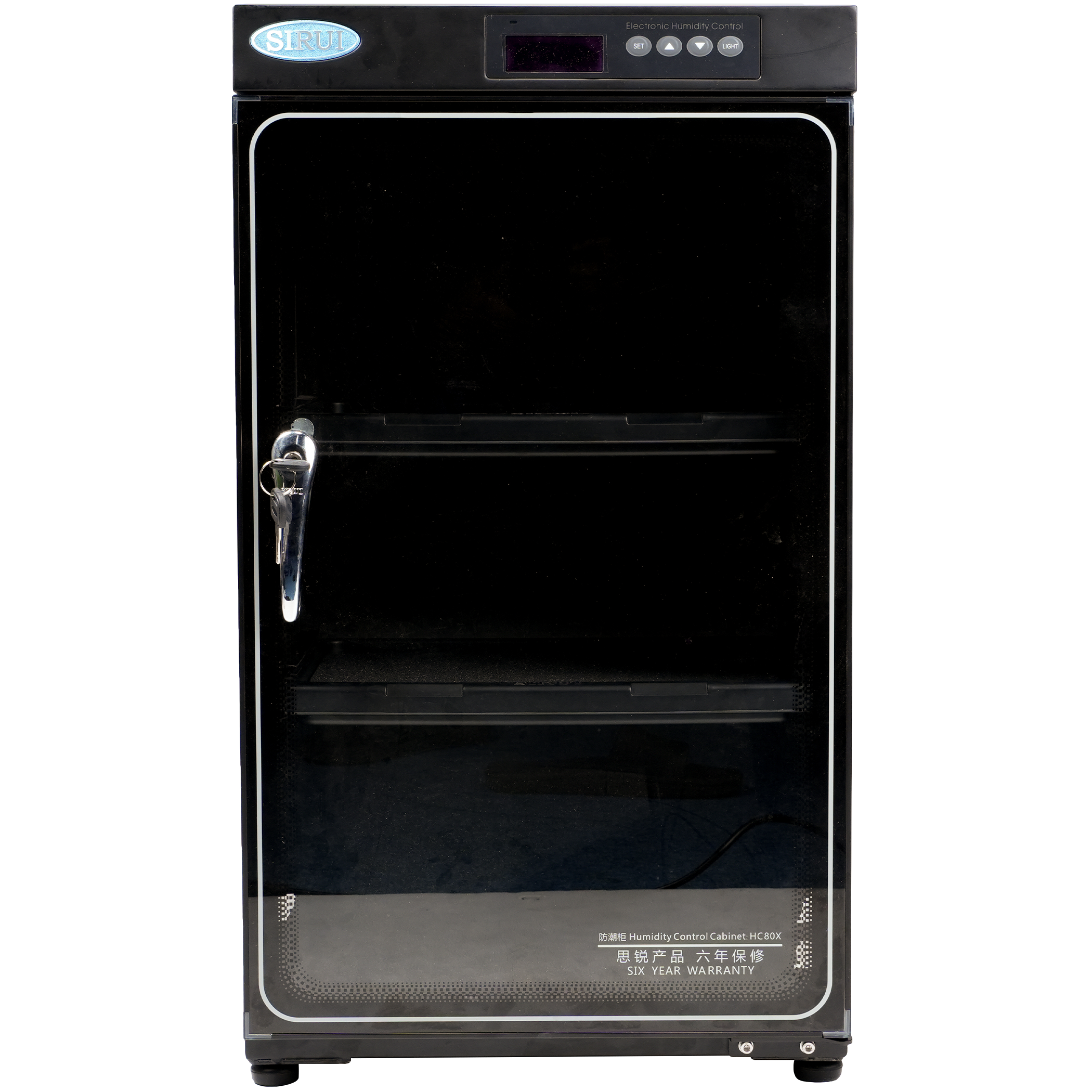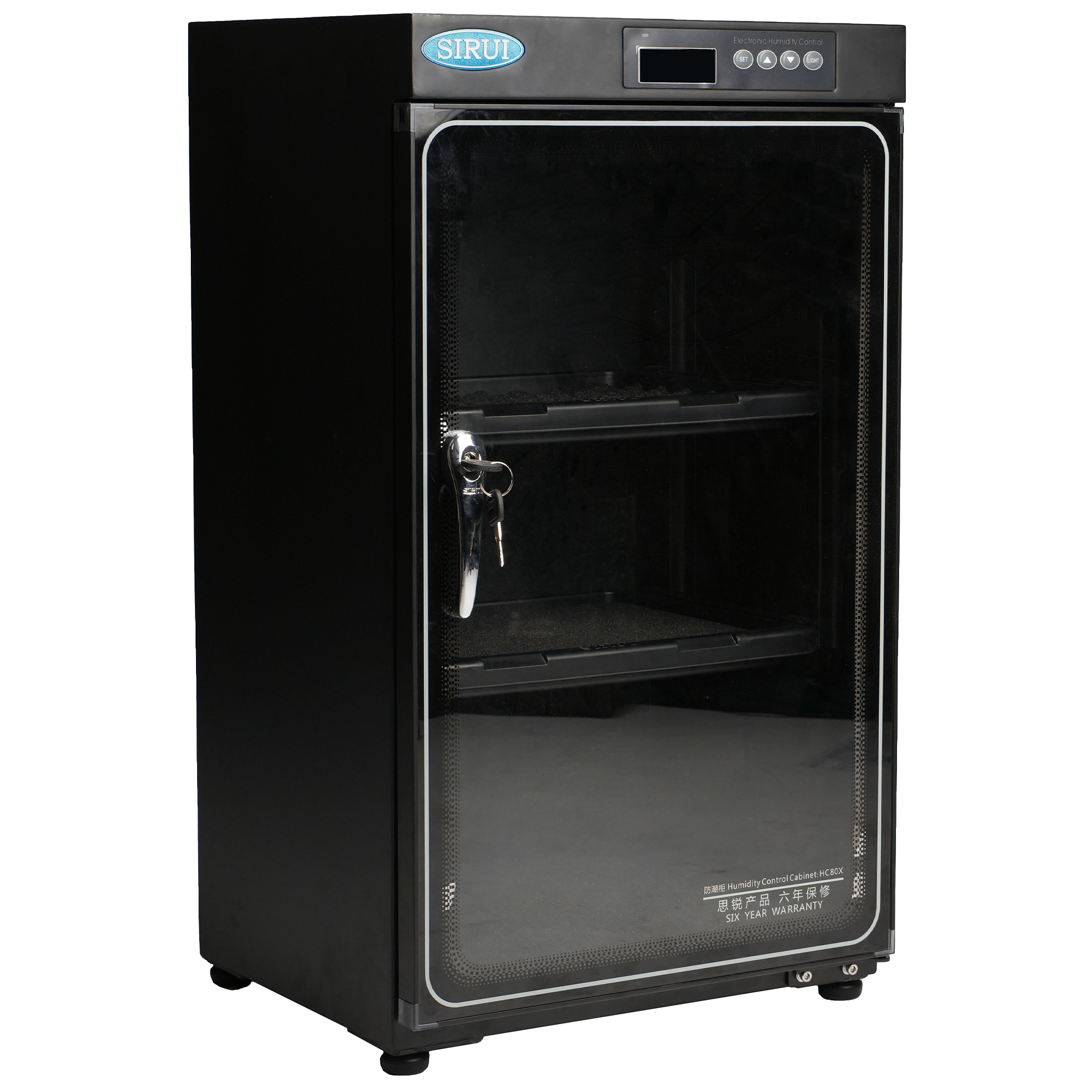 Designed with a cold-rolled steel enclosure and a tempered glass door with an airtight seal, the HC80X offers professional-grade durability with a clean, modern appearance. Two adjustable foam-padded shelves allow flexible organization, while the easy-to-read LCD display and smart memory function ensure consistent humidity control even after power interruptions.