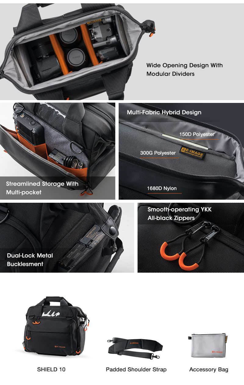 The E-Image SHIELD Camera Bag is a premium line of camera bags engineered for professionals who demand durability, modularity, and style. Designed to accommodate a wide range of equipment setups—from lightweight mirrorless cameras to full filmmaking rigs—the SHIELD 10, 20, and 30 models offer exceptional load capacity and efficient gear access. With a dual-layer expandable design, versatile storage compartments, and a robust exterior, these bags are tailored for both urban and outdoor shooting scenarios. Crafted with military-grade materials such as 1680D tear-resistant nylon and secured with YKK double-lock zippers, the SHIELD series ensures your gear stays protected in the most demanding conditions.