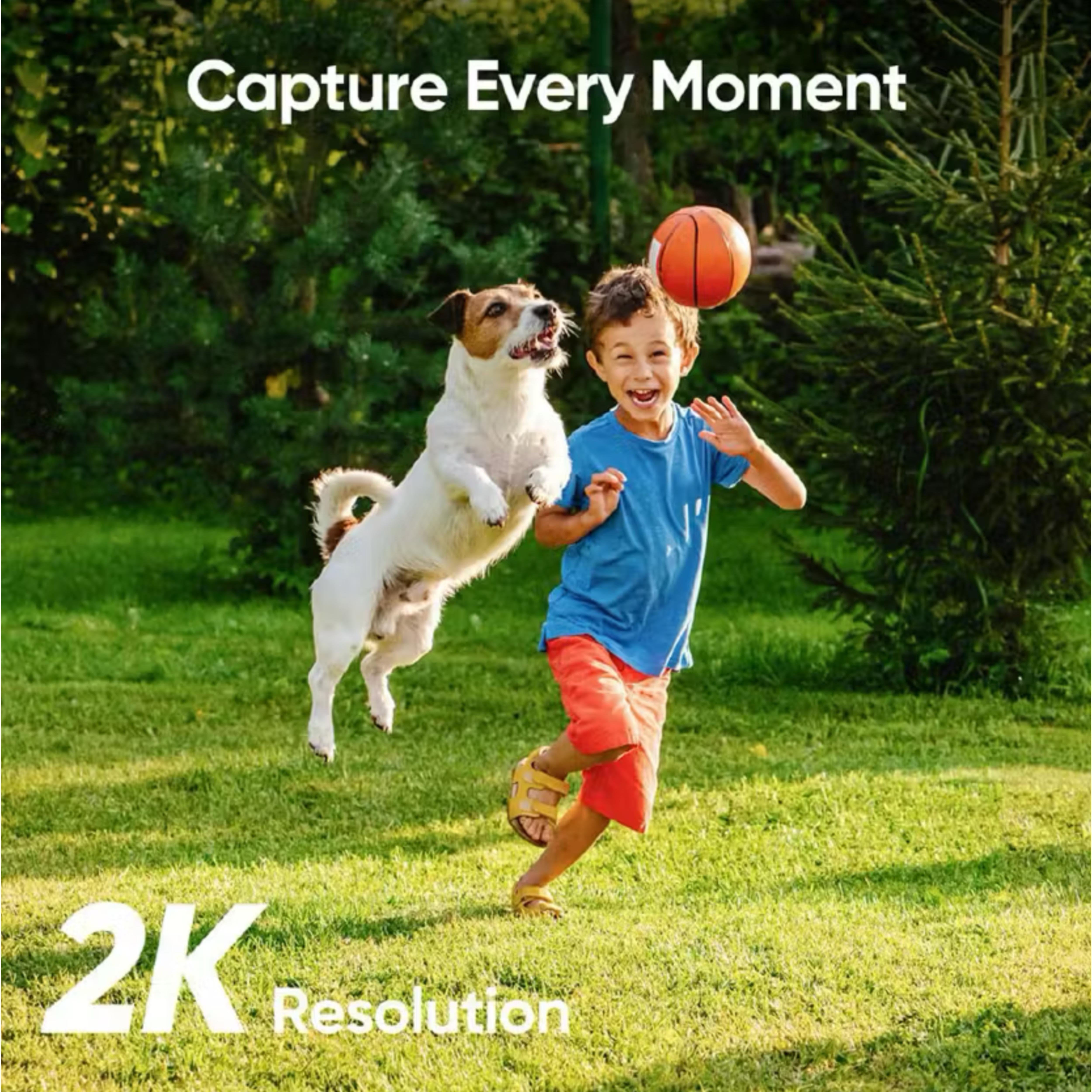 Each camera delivers 2K (2304x1296) video resolution with 4x digital zoom and night vision up to 10 m, providing clear day and night footage.