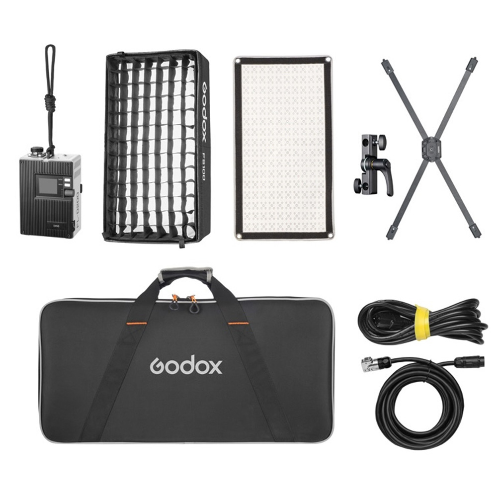 Out of the box, the FL100R is ready to go. It includes a softbox with a fabric grid for directional lighting, a metal frame for mounting the flexible mat, a robust controller with a built-in V-mount plate, a light stand clamp, and an AC adapter—all neatly packed in a padded carrying case.