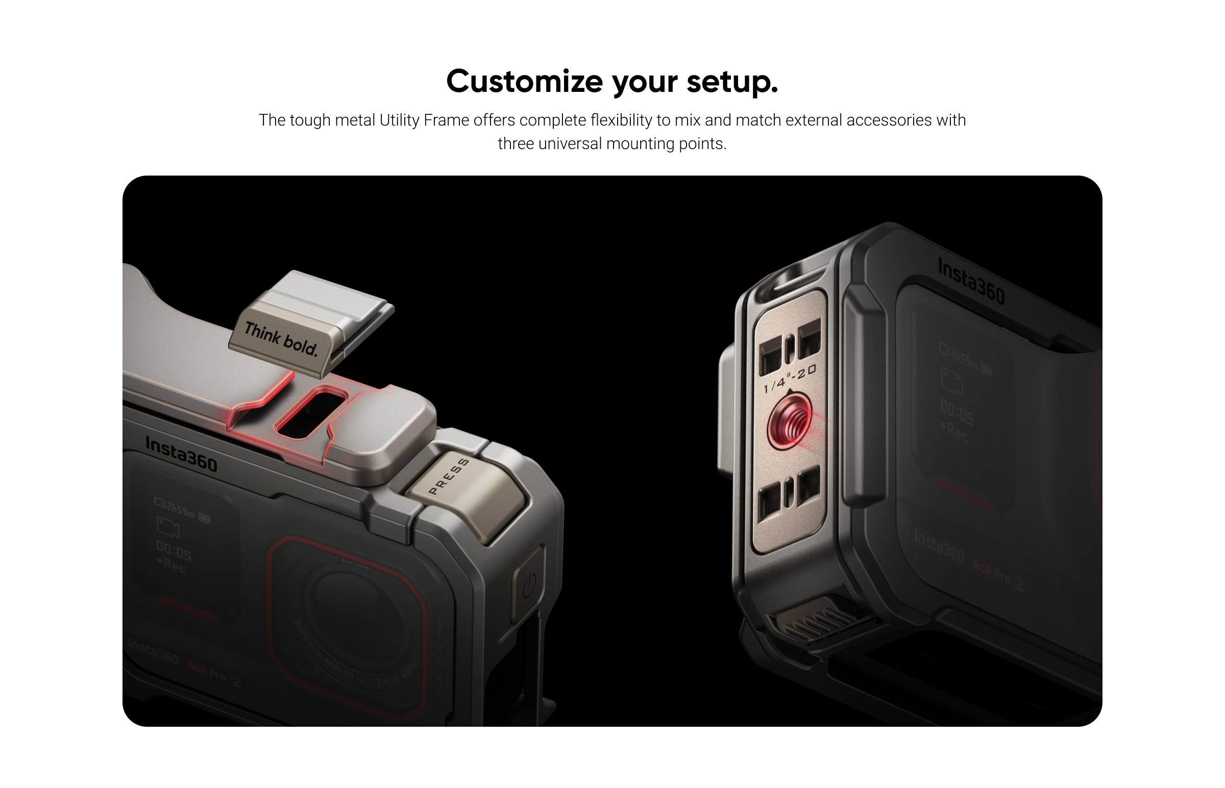 The included Insta360 Xplorer Grip Kit adds a rugged utility frame and ergonomic grip for handheld shooting. Featuring a cold shoe mount, 1/4"-20 thread, and integrated shutter button, it enhances stability and expands accessory compatibility while protecting your camera in the field.