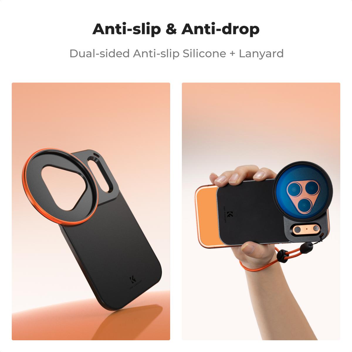 The K&F Concept Magnetic Lens Filter Mount Adapter for iPhone 17 Pro is custom-designed for the iPhone 17 Pro camera module. Its triangular lens cutout and rectangular deco cutout fit perfectly, while the large flash opening and antenna hollowing prevent light leakage and maintain signal integrity. The mount does not interfere with the camera lens or flash when attached.