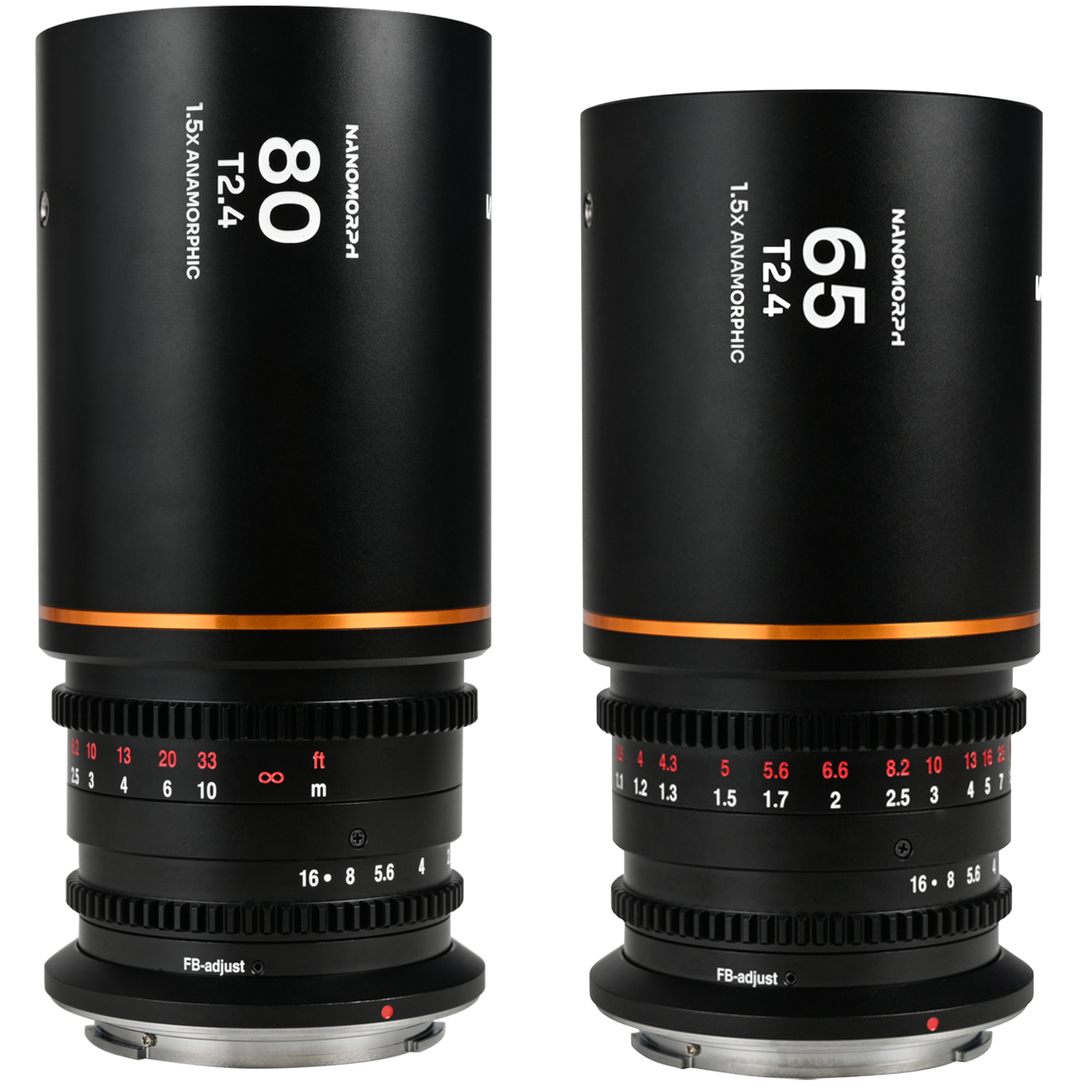 The Venus Optics Laowa Nanomorph 65 & 80mm Anamorphic Primes are compact, lightweight S35 lenses delivering a consistent 1.5× anamorphic squeeze with amber color flare and cinematic oval bokeh. Both primes feature telephoto compression ideal for close-ups, an aperture range of T2.4 to T16, and 13-blade irises for soft, organic rendering.
