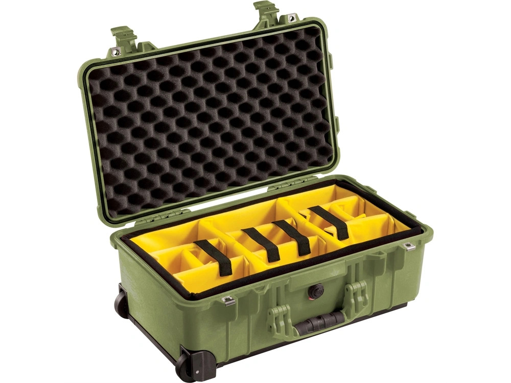 The olive drab Pelican 1510 Carry On Case with Yellow and Black Divider Set is an unbreakable, watertight, airtight, dustproof, chemical resistant and corrosion proof hard case used to carry any kind of equipment that needs to be protected from the elements. It is made of Ultra High Impact structural copolymer that makes it extremely strong and durable. It has a 6.4 mm neoprene o-ring, and includes an automatic purge valve for quick equalisation after changes in atmospheric pressure. It has a hinged case with double ABS latches that seal perfectly and padlock protectors that provide added strength and extra security against cutting and theft.