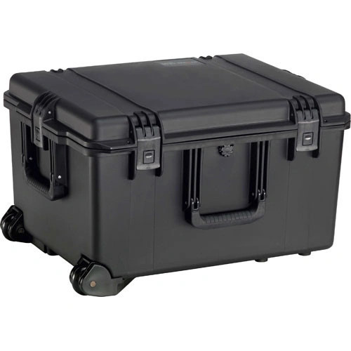 The Pelican iM2750 Storm Trak Case without Foam (Black) is an injection-moulded case made of HPX high performance resin, that is virtually unbreakable, dent-resistant and shatter-resistant. It is tough, rugged, lightweight, airtight and watertight. There is a permanently attached Vortex valve that automatically adjusts air pressure without letting in water, and won't unscrew from the case. Press & Pull latches open with the push of a button, yet stay closed securely under impact or stress. The case has unbreakable moulded-in hasps that allow the addition of standard size padlocks. It has hinges with integrated feet that hold fast under impact, and create a flat surface for upright stability. It is carried by three double-layered, soft-grip, solid-core handles, lightweight retractable, telescoping handle and rugged in-line wheels.