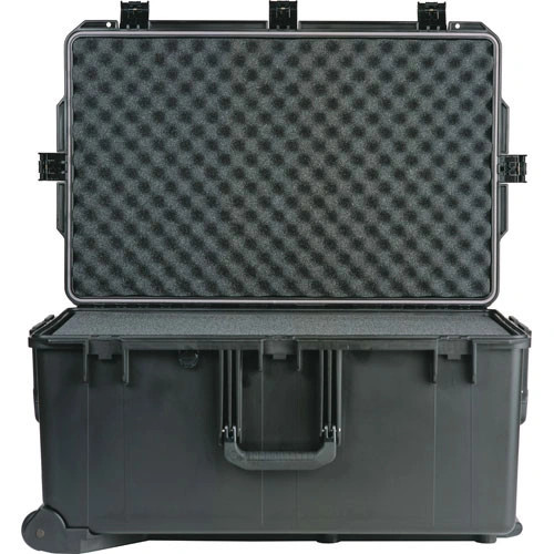 The Pelican iM2975 Storm Trak Case with Foam (Black) is an injection-moulded case made of HPX high performance resin, that is virtually unbreakable, dent-resistant and shatter-resistant. It is tough, rugged, lightweight, airtight and watertight. There is a permanently attached Vortex valve that automatically adjusts air pressure without letting in water, and won't unscrew from the case. Press & Pull latches open with the push of a button, yet stay closed securely under impact or stress. The case has unbreakable moulded-in hasps that allow the addition of standard size padlocks. It has hinges with integrated feet that hold fast under impact, and create a flat surface for upright stability. It is carried by three double-layered, soft-grip, solid-core handles, lightweight retractable, telescoping handle and rugged in-line wheels.