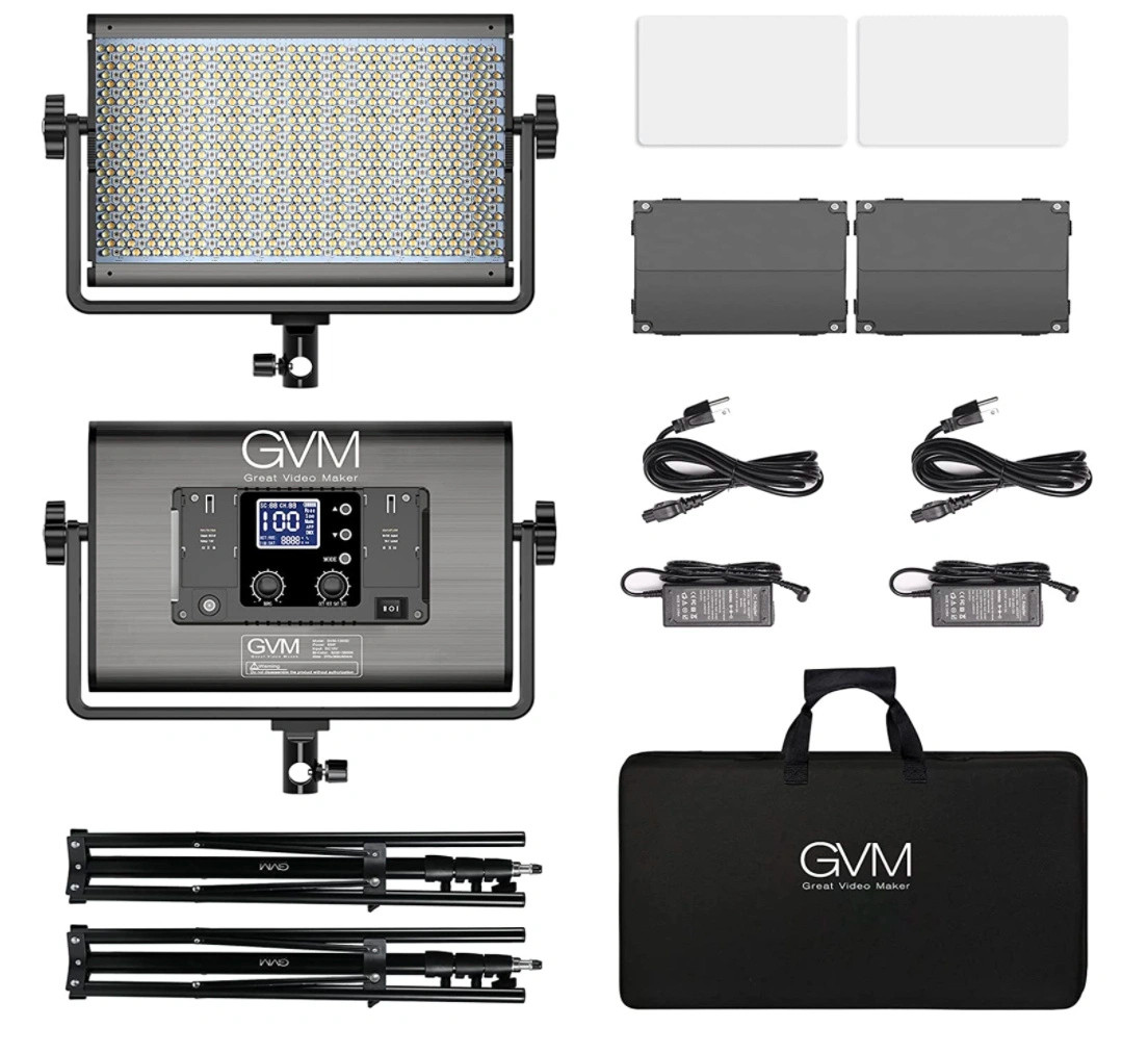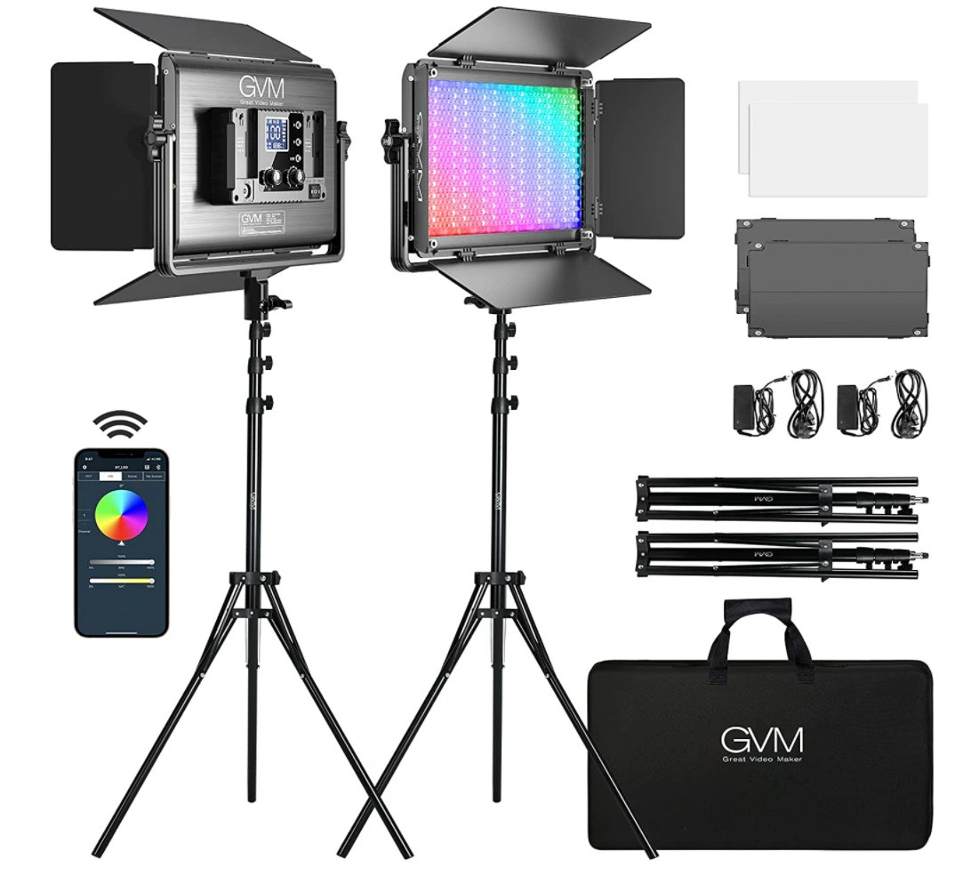 The GVM RGB LED Studio Video Light Bi-Colour Soft 2-Light Panel Kit contains two dimmable panels with colour that's variable from 3200 to 5600K.