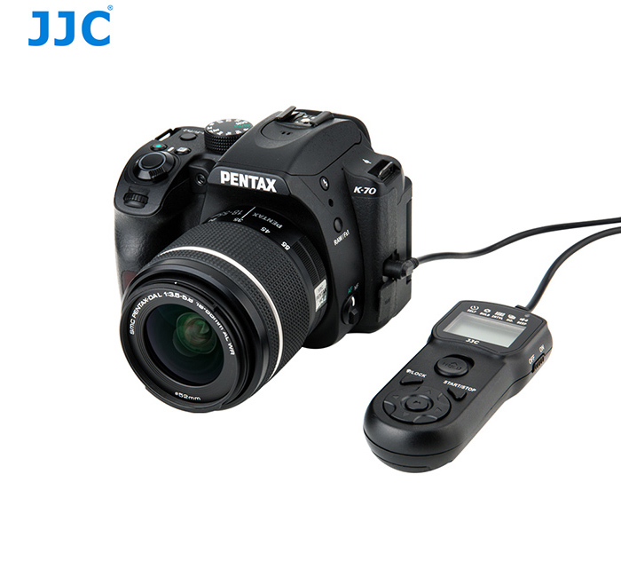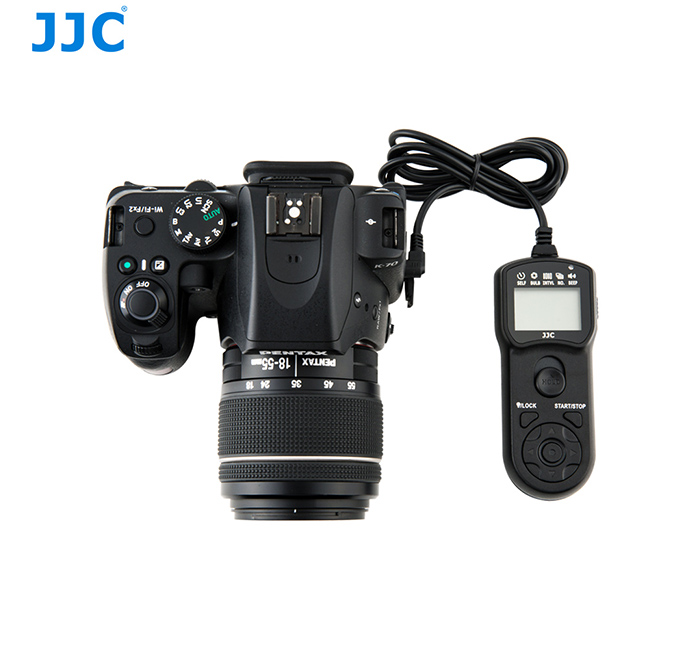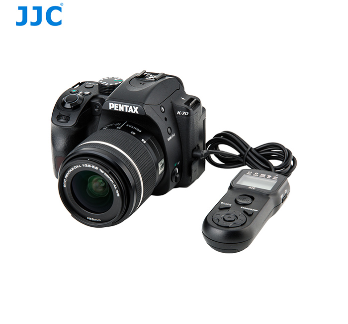 The JJC® TM is a remote control with an cord and a self-timer, interval timer, long-exposure timer, and exposure-count setting feature. The timer can be set anywhere from 1 sec. to 99 hrs., 59 min., 59 sec. The maximum number of exposure is 399 or unlimited.