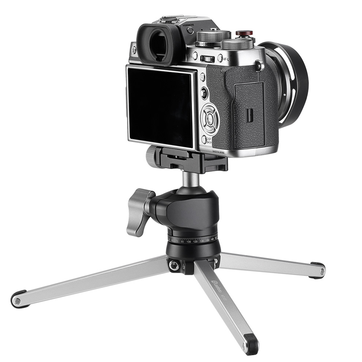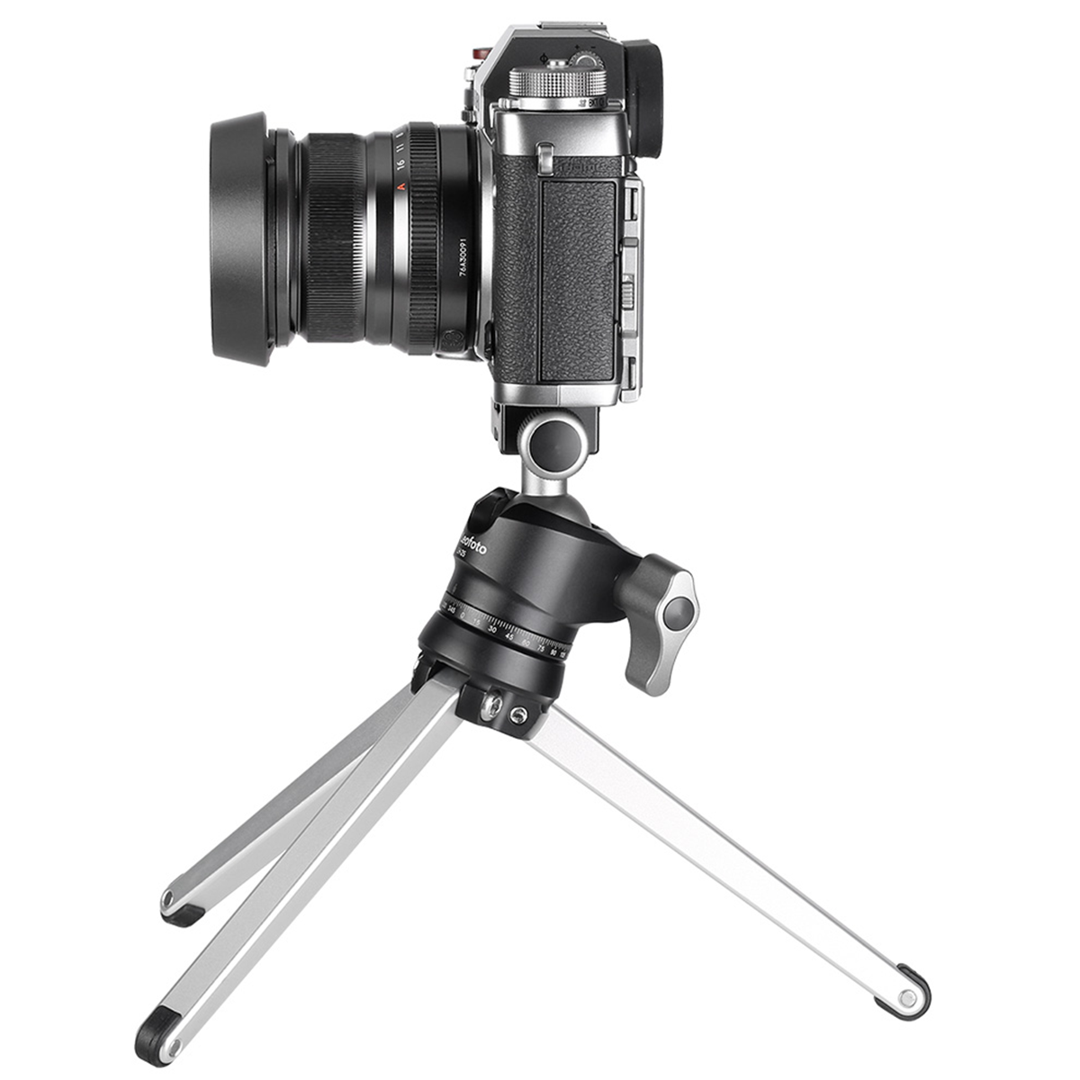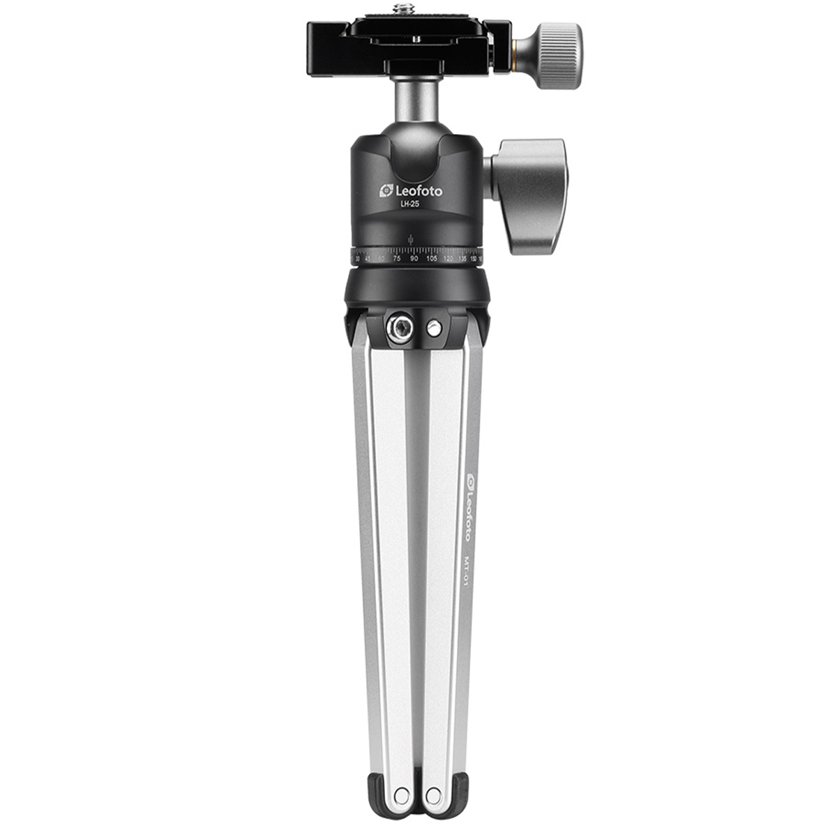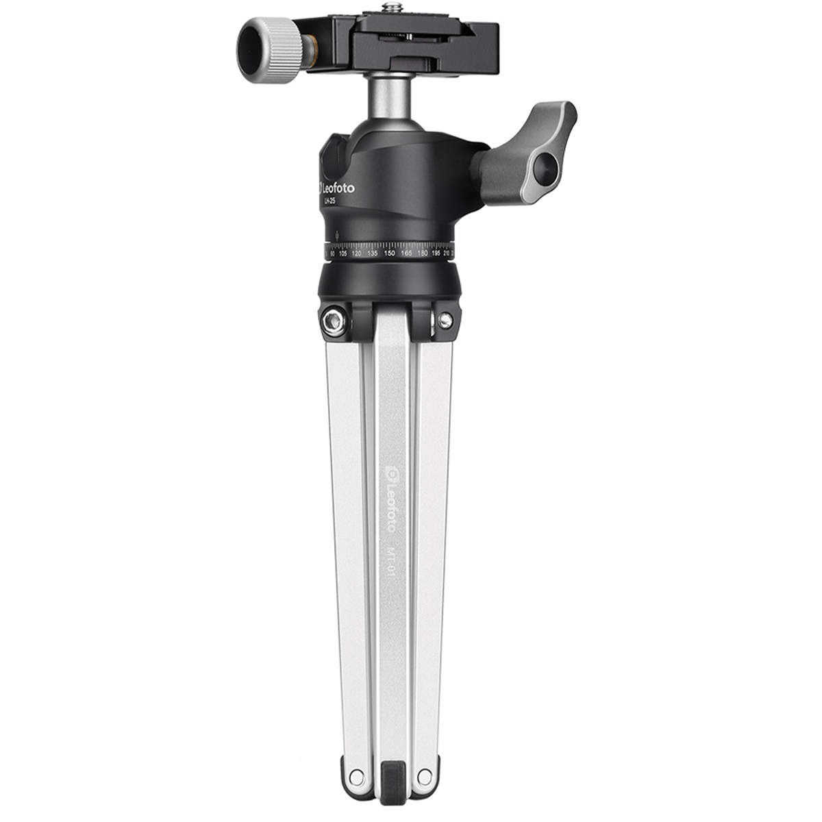 The Leofoto MT-01+LH-25 Mini Table Tripod with Ball Head is a lightweight and compact tripod, weighing just 340g. It features a stable, no-column design and a low profile ball head with a large main locking knob for easy handling. The laser-engraved scale on the panning base allows for precise control during panorama shooting.