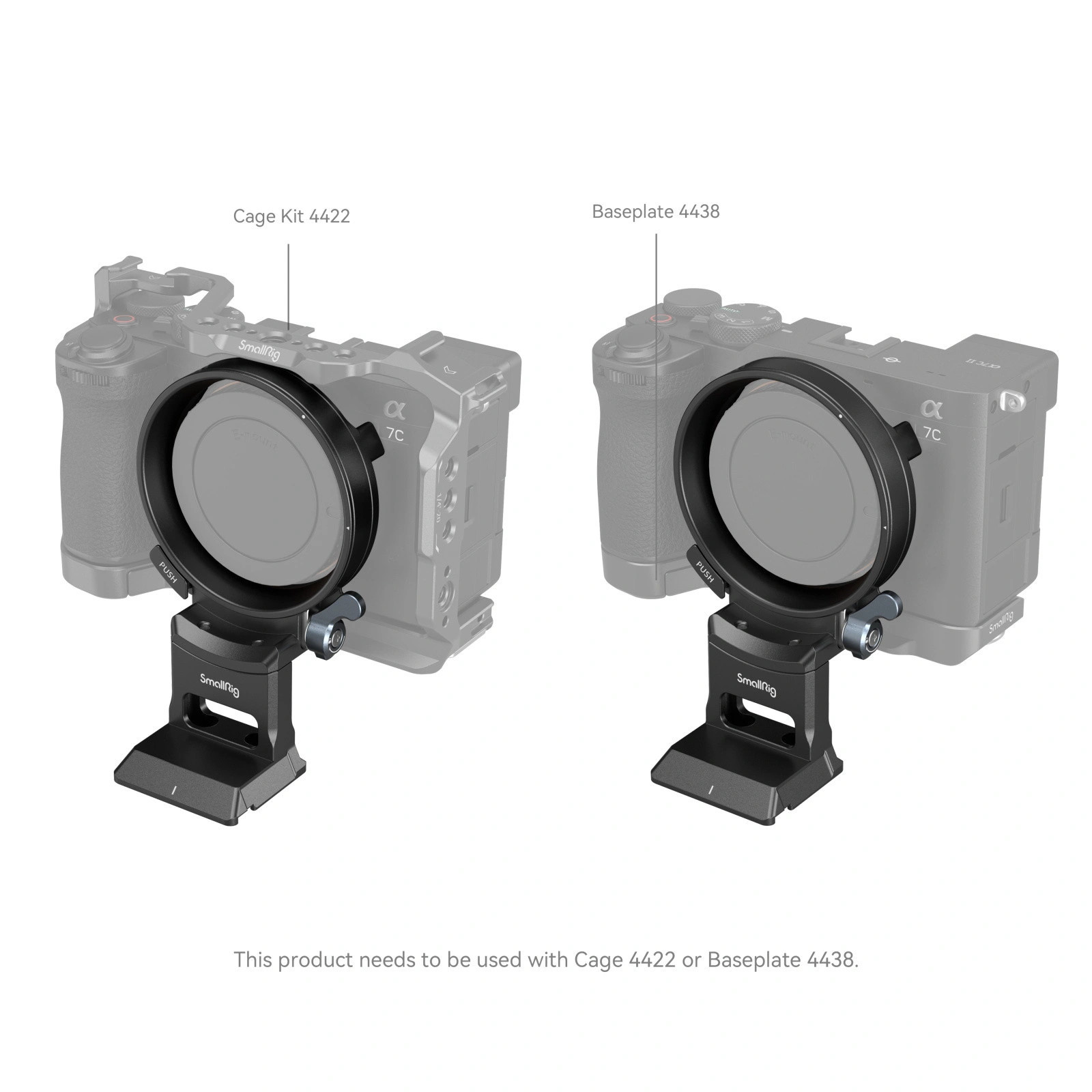 The SmallRig 4424 Horizontal-to-Vertical Mount Plate for Sony Alpha 7C II / Alpha 7CR is designed to be used with Cage 4422 or Baseplate 4438 to quickly switch between horizontal and vertical shooting without adjusting the lens optical axis. It maintains full access to LCD flip screens and ports and features built-in pads that prevent scratches and twists. Compatible with Arca-type / Manfrotto RC2 tripod and DJI RS-series gimbals, the lens collar mount plate can rotate by 90 degrees by merely unlocking a knob to switch between horizontal and vertical shooting; its bottom 1/4"-20 and 3/8"-16 threaded holes also support other quick-release plates.