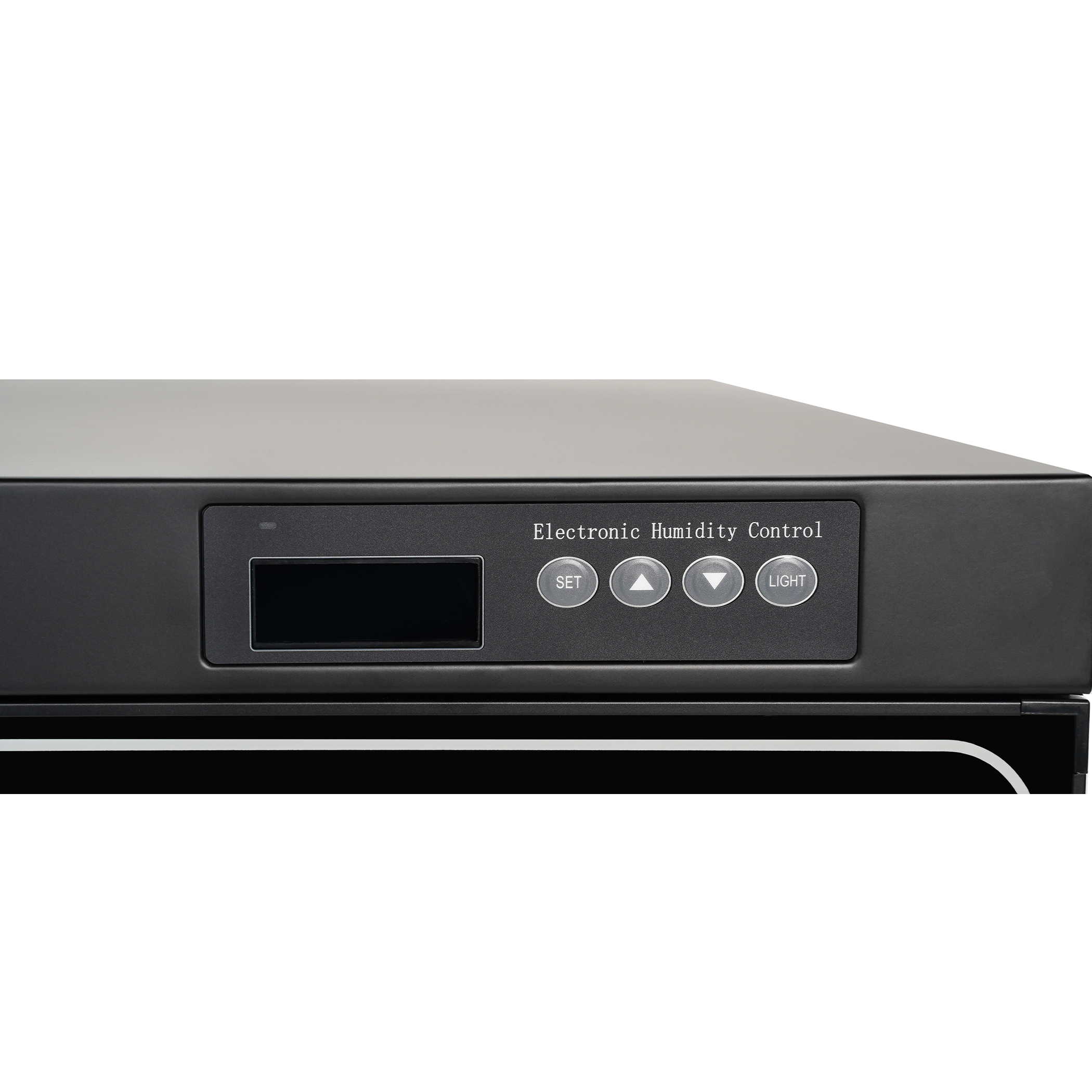The HC100X remembers previous settings even after a power outage thanks to its smart memory function. Humidity and temperature are displayed on a clear LCD screen with button-based controls for easy adjustments. Manual LED lighting allows better visibility of stored items when needed.