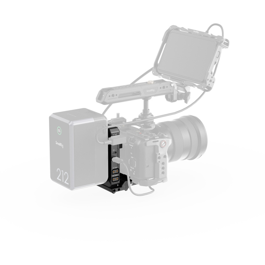 Strategically positioned power outputs on the V-mount battery plate, including D-Tap and USB-C, enable simultaneous power supply to multiple devices without interfering with camera or top handle operation. The USB-C port supports up to 65W PD input, allowing it to function as a V-mount battery charger.