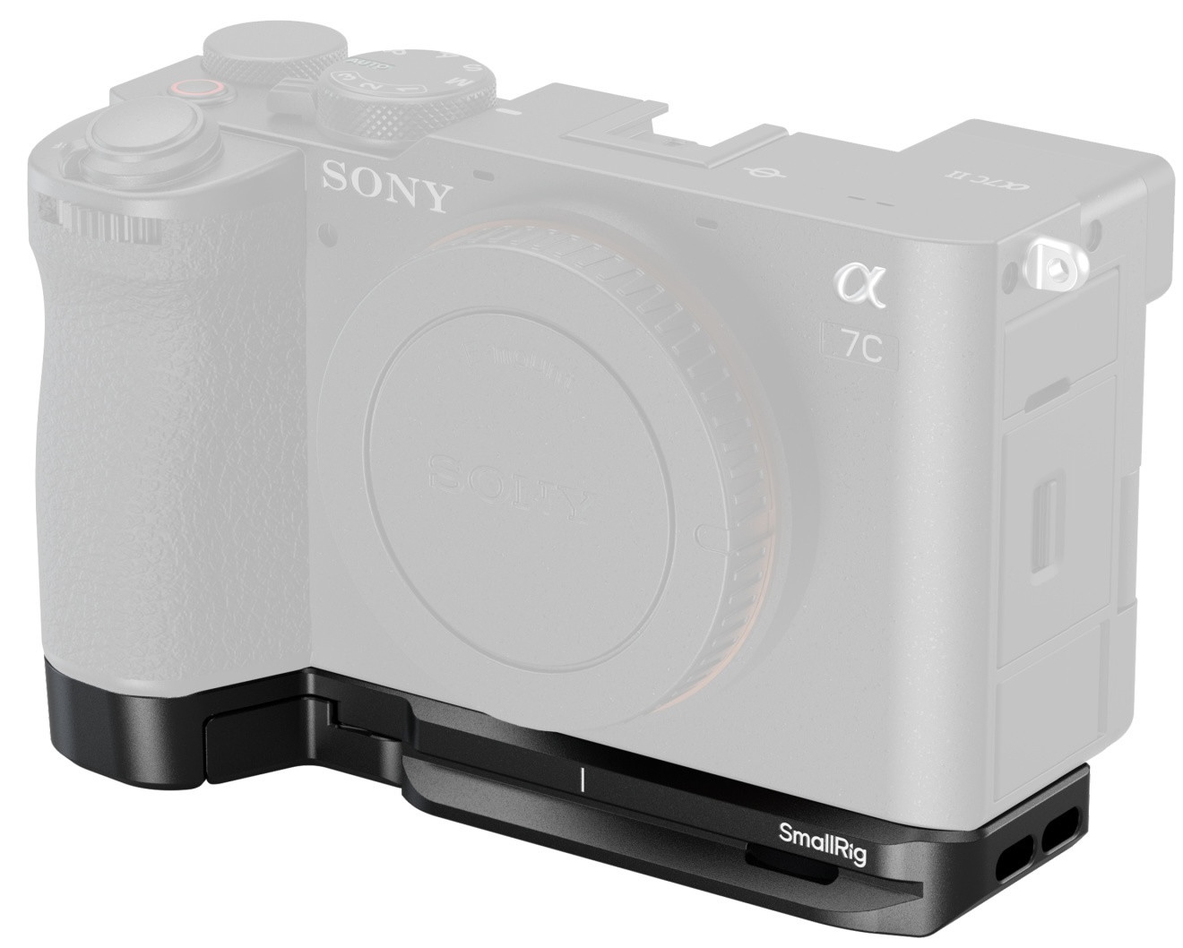 The SmallRig Baseplate with Airtag Slot for Sony Alpha 7C II / Alpha 7CR (Black) 5481 enhances grip comfort and protects your camera from impacts. It mounts securely using a 1/4"-20 screw and includes protective pads to prevent scratches and deflection. A built-in slot accommodates an AirTag for easy camera tracking, while a hinged arm near the battery compartment provides ergonomic pinky support.