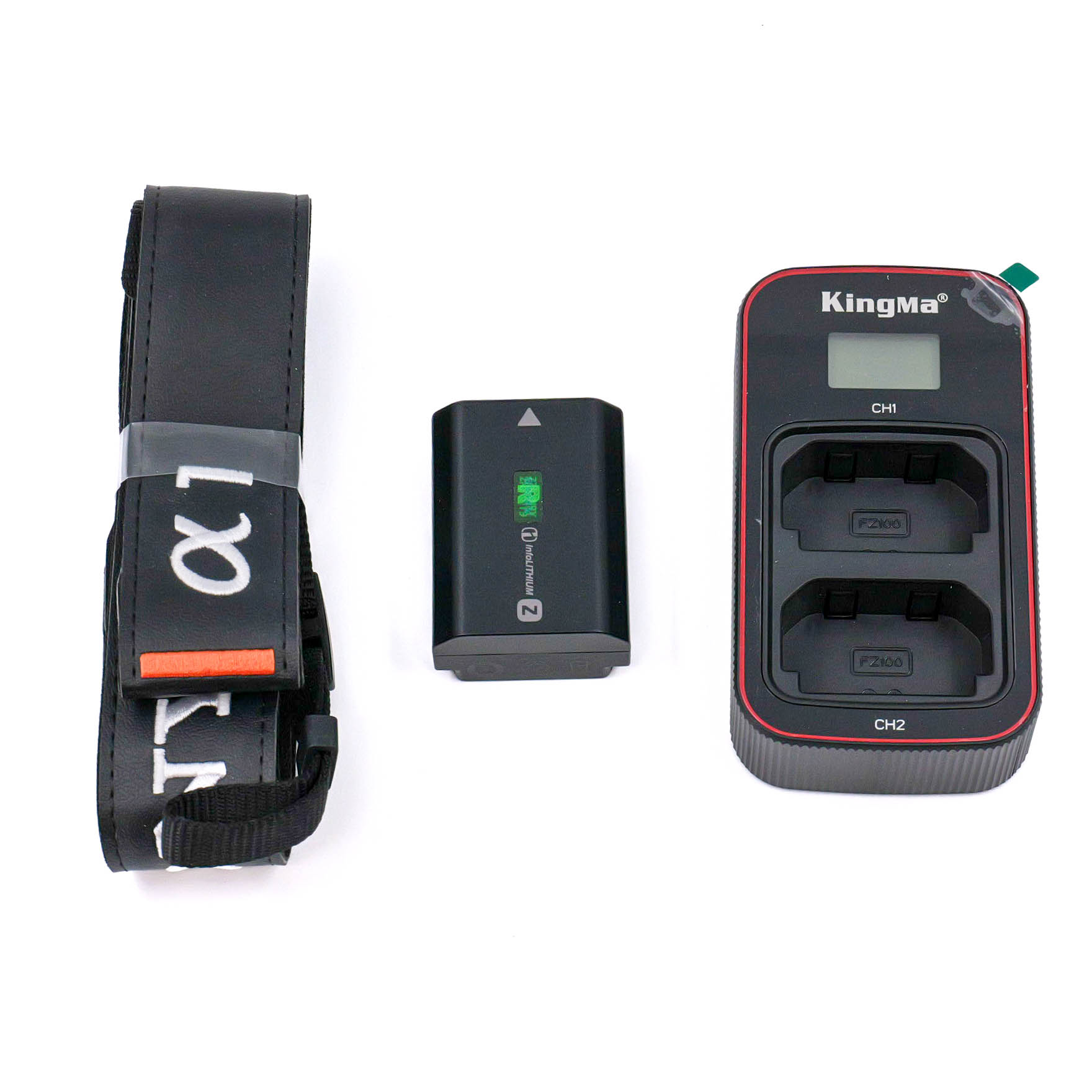 Shutter count: 1,300. Comes with box, battery, charger (Kingma), strap, and manual.