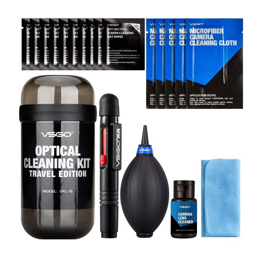 The VSGO Camera Cleaning Kit (DKL-15) is a comprehensive cleaning solution designed for photographers who need reliable and portable tools to maintain their camera gear. This all-in-one kit includes essential items like a mini air blower, lens cleaning pen, microfiber cloths, wet wipes, alcohol-free lens cleaner, and a protective storage case.